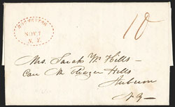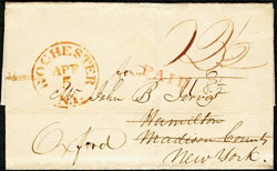 Postage rates were written or ink-stamped on the folded paper or envelope before the creation and use of the postage stamps. The American Stampless Cover Catalog lists the known types and varieties found by specialists for fellow collectors. It has been nearly 20 years since the catalog's last update, but an online effort has started that process. Click the list at the right or the Word icon to see Rochester's marking entries that will appear in the next catalog. Red