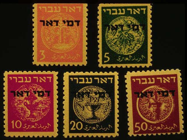These five stamps are the first issue of postage dues. They are the same values as the first postal issue, minus the 15-mil value. They were printed on yellow paper with the imprint, "Dmei Doar," which means postage due. With tabs intact, this set would be very valuable. |