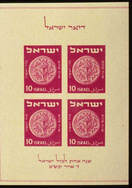 The Tabul Exhibition souvenir sheet commemorates the National Stamp Exhibition held the first week of May 1949 in Tel Aviv. It features the 10-mil value of the first stamp issue of Israel.