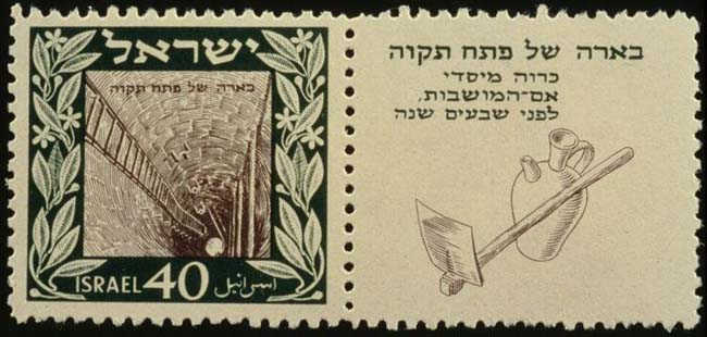 This stamp shows what the Israeli collector calls a short tab. This stamp was issued August 10, 1949, to honor the city of Petah Tikva. The perforations at the right of the tab show that there was more selvage area beyond those perforations. This short tab is worth about $25 less than an example with the full tab. You'll see full tabs a bit later. This and the next few slides will serve as a quick lesson on tabs. |