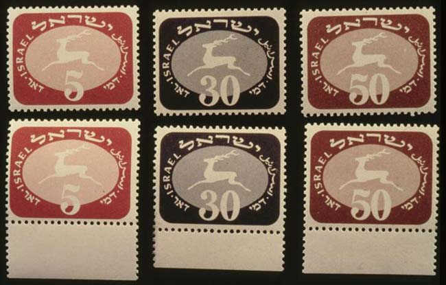 These are singles and "tab singles" of part of the third postage due series. In the case of postage dues, the tab is simply selvage. Yet the knowledgeable collector would pay thousands of dollars for a set of "tab singles" of Israel's first postage due series versus less than $100 for the mint singles. |