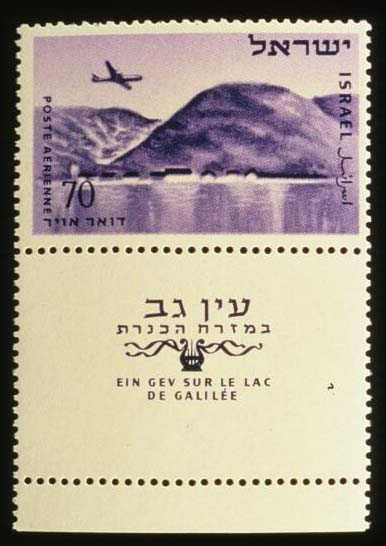 This stamp was issued in 1954 as part of a series of air mail stamps. The series show views of different Israeli towns. This shows En Gev, on the eastern shore of Lake of Galilee.