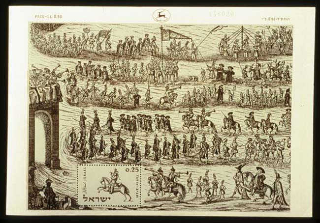 This is the Taviv souvenir sheet of 1960. It is a fascinating piece of artwork, depicting the Jewish Postal Carrier of Prague, from a copper engraving printed in Prague in 1741.