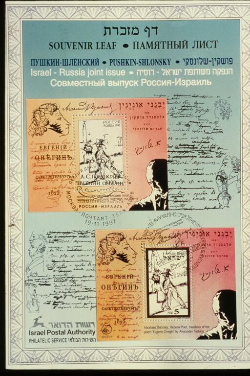 The joint issue of Russia and Israel issued in 1997 commemorating the translation of Pushkin's novel "Eugene Onegin" into Hebrew. UNESCO declared 1999 as "Pushkin Year," as it is the 200th anniversary of Pushkin's birth.