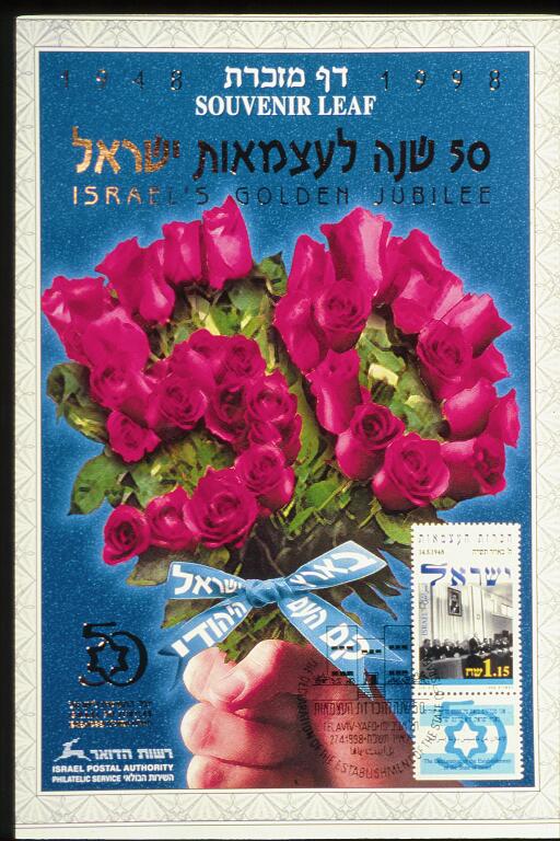 And finally, here is the Golden Anniversary of Israel being celebrated. The reverse of the souvenir page has the Declaration of Independence of the State of Israel written in Hebrew, and also shows a reproduction of the signers of the declaration.