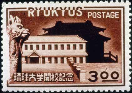Released on February 12, 1951, this stamp celebrated the opening of Ryukyu University. The main campus building was built on the site of a former shrine (silhoetted in the background) which was bombed during World War II.