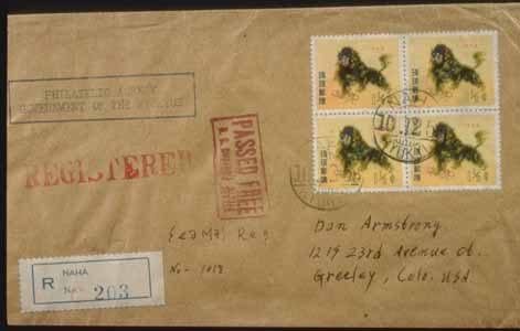 The front of this registered cover has a block of four 1 1/2 cent Lion's Dance New Year's issue released on December 10, 1958. Two men actually are under the lion skin. Under the paws are balls that are tossed around during street performances at festivals. Five cents paid the registration fee. |