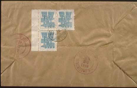 This is the reverse of that same cover, where the 30 cents postage for the airmail rate can be seen using three ten cent definitives.