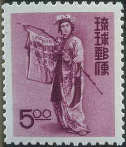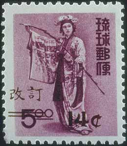 To meet the urgent need for airmail stamps, remainders of the 5 yen (old currency) dancer stamp of 1956 was overprinted and revalued to 14 cents. Remainders of four other stamps were similarly revalued and alos released on August 3, 1960. |
