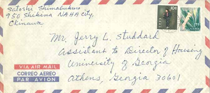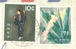 Most covers mailed from Okinawa bear the Naha cancel from the capital city. Cancels from other towns and villages can be quite hard to find. This one from Shuri, the former imperial city, covers the 27 cent airmail rate to the U.S. using stamps from the two series just reviewed. |