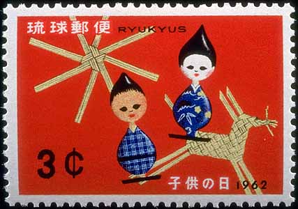 Children's Day was celebrated with this 3 cent stamp on May 5, 1962. These dolls and toys are made of leaves.