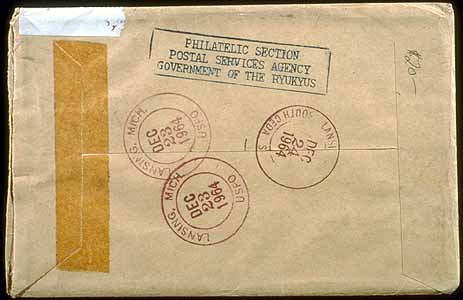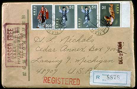 This registered cover shows dancers from the 1960 issue (1 cent), 1962 issue (5 cents), and the January 20, 1964 issue (20 cents). Mailed from Naha, Okinawa on November 16, 1964, it took over five weeks to eventually reach its Michigan destination. It probably contained stamps, as it was mailed from the Ryukyus Philatelic Section. |