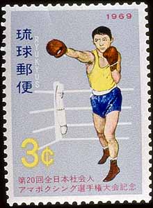 This stamp was issued January 3 to promote the All-Japan Amateur Boxing Championships. The competition was held January 3-5 in the gymnasium of the University of Ryukyu.