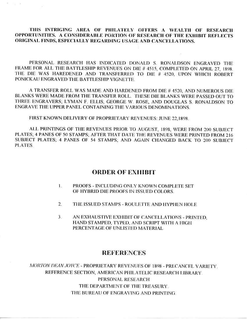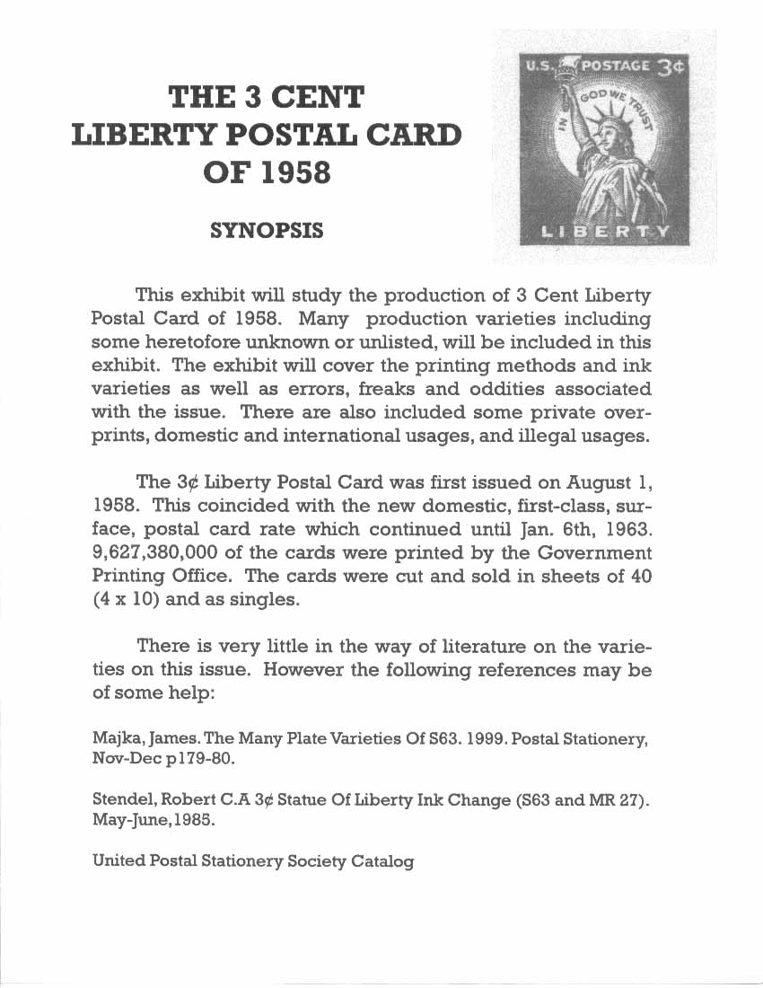 This exhibit studies the production varieties and postal history of the 3 cent Liberty postal card of 1958. |