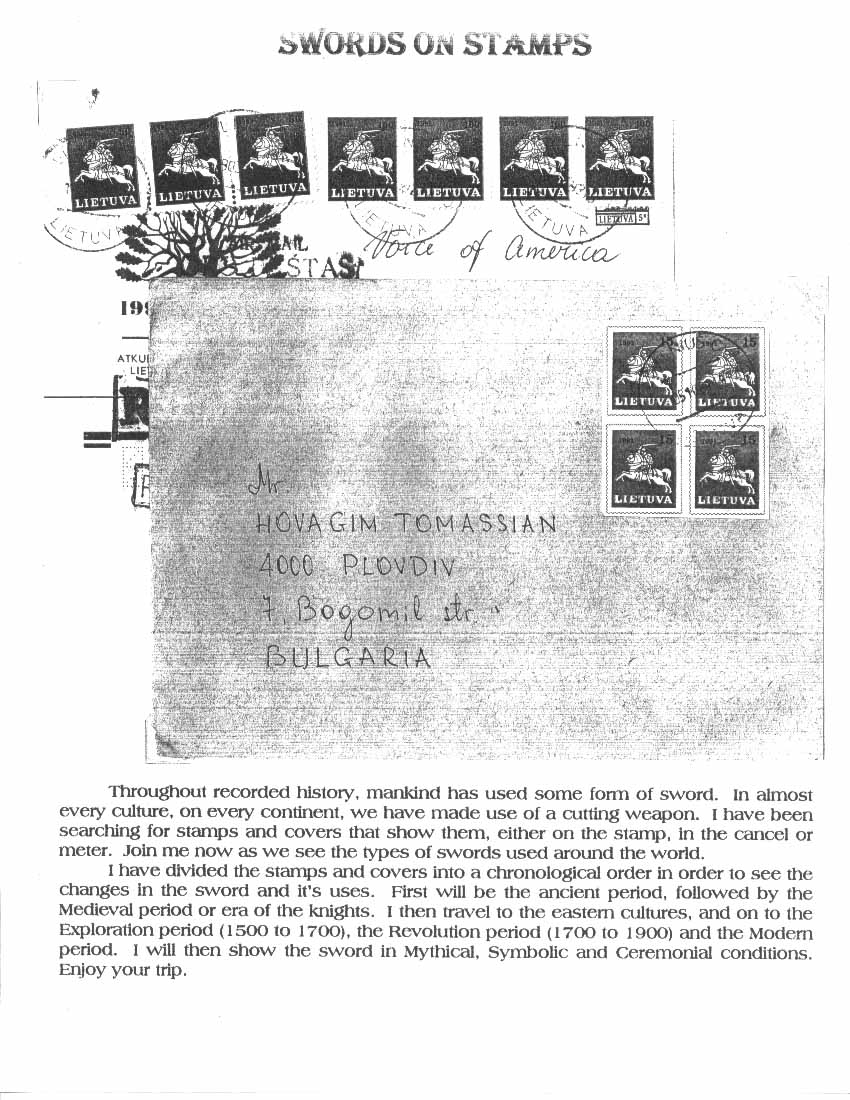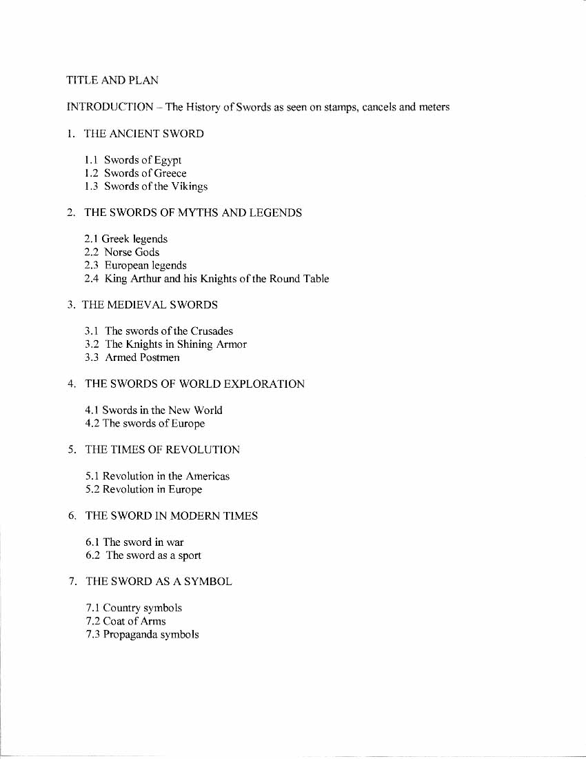 The history of swords seen through stamps, cancels and meters, divided into time frames: Ancient, Myths and Legends, Medieval, Exploration, Revolution, Modern and symbols. |