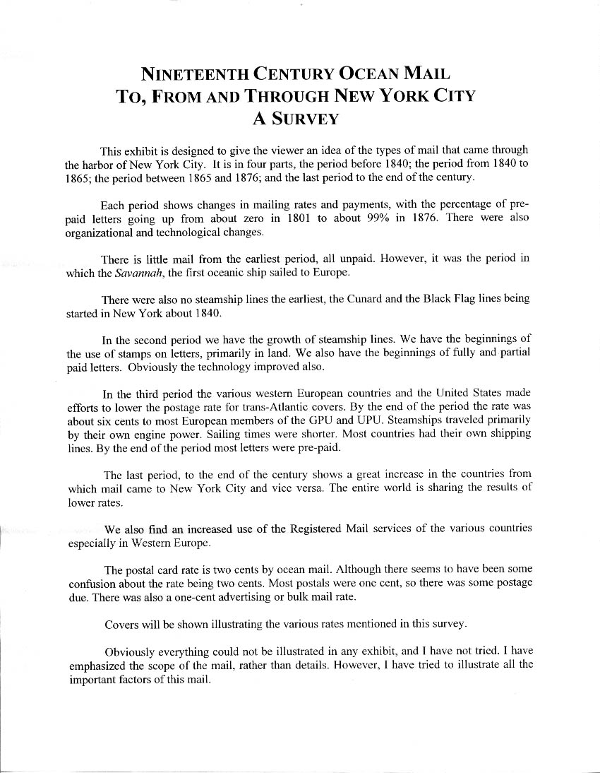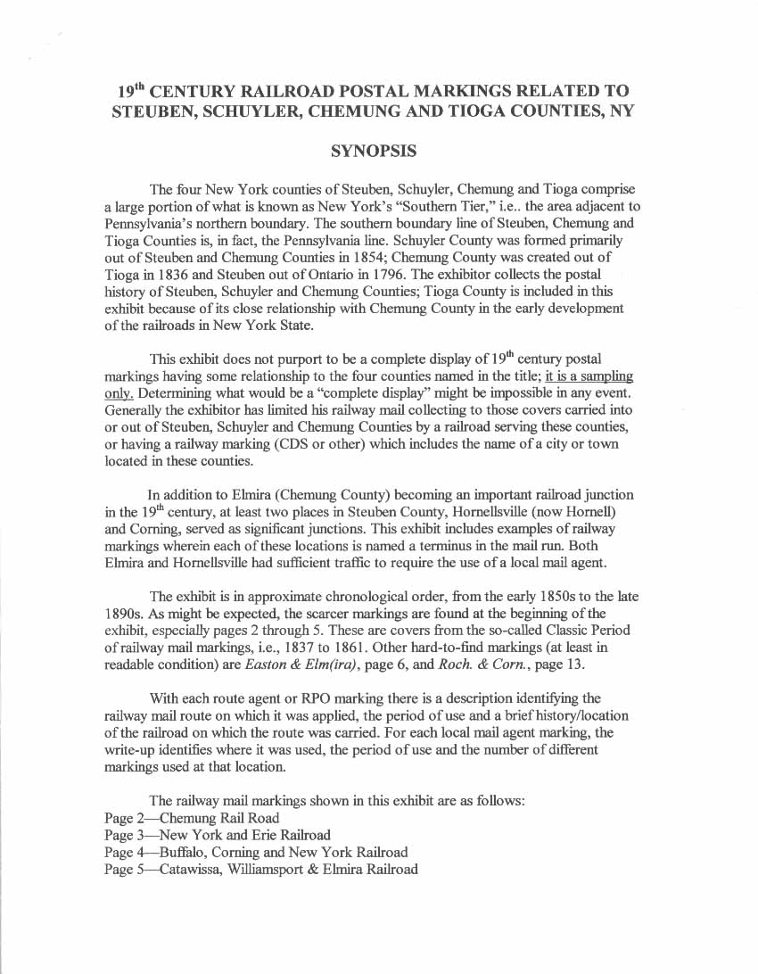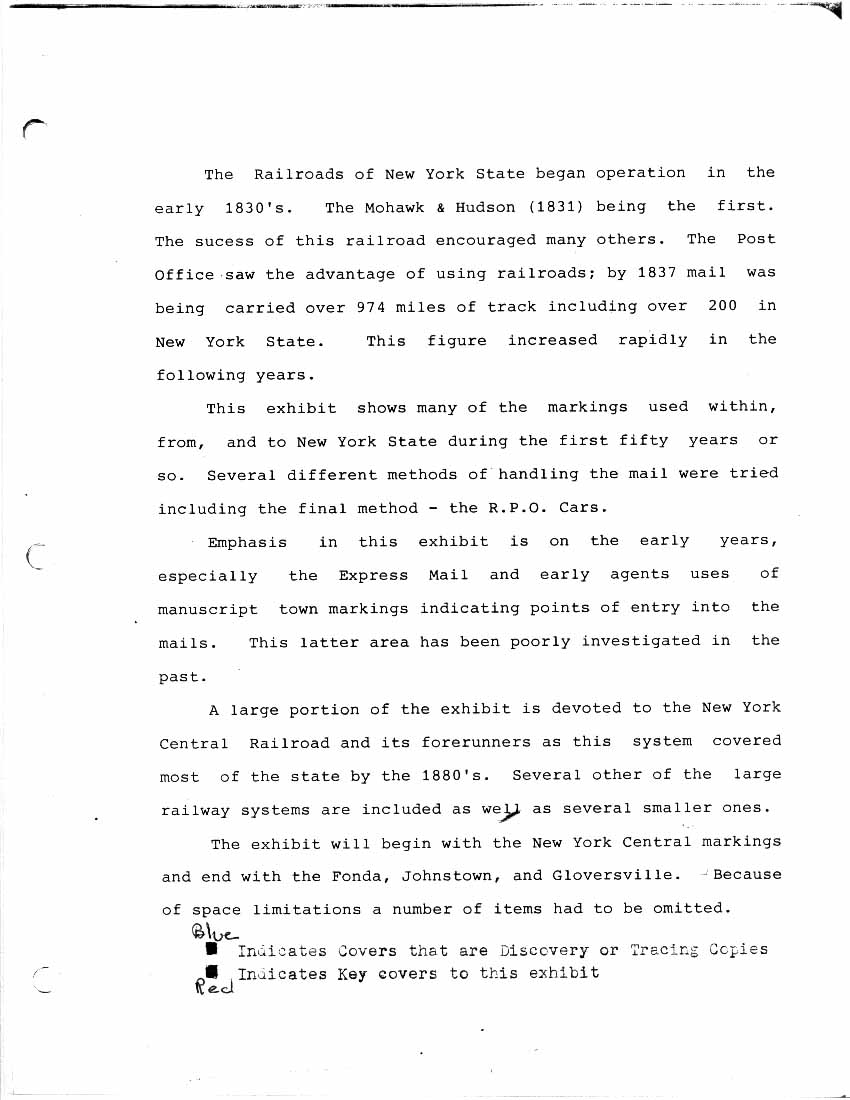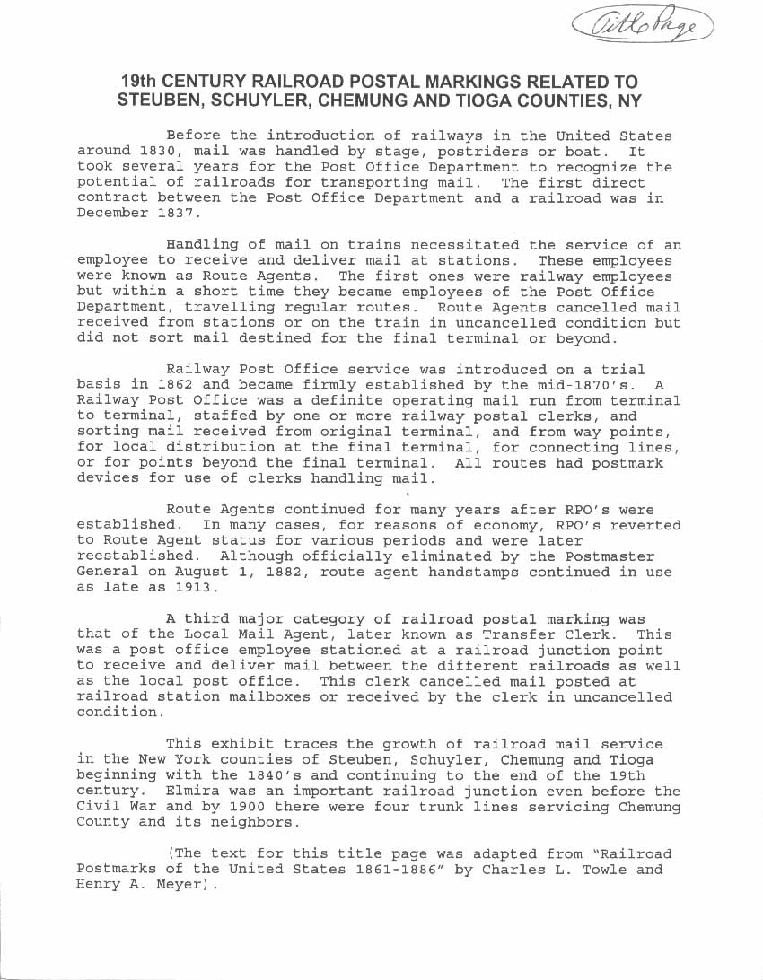 Route agent, postal clerk and station agent markings used within, from and to New York State covering the first 50 years of railroad postal operations. |