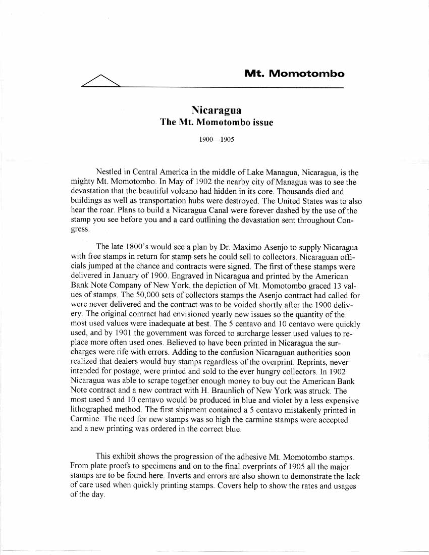 An exhibit displaying the adhesive stamps of Nicaragua from 1900-1905 depicting the Mt. Momotombo volcano. |