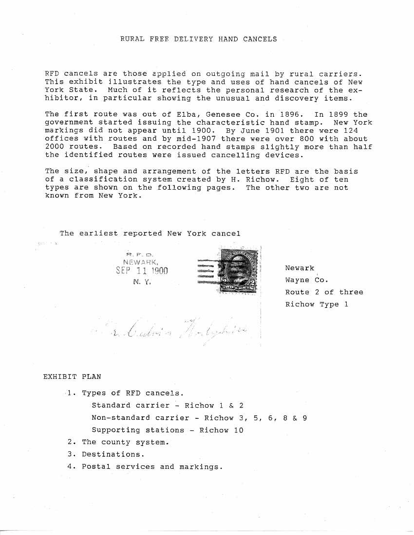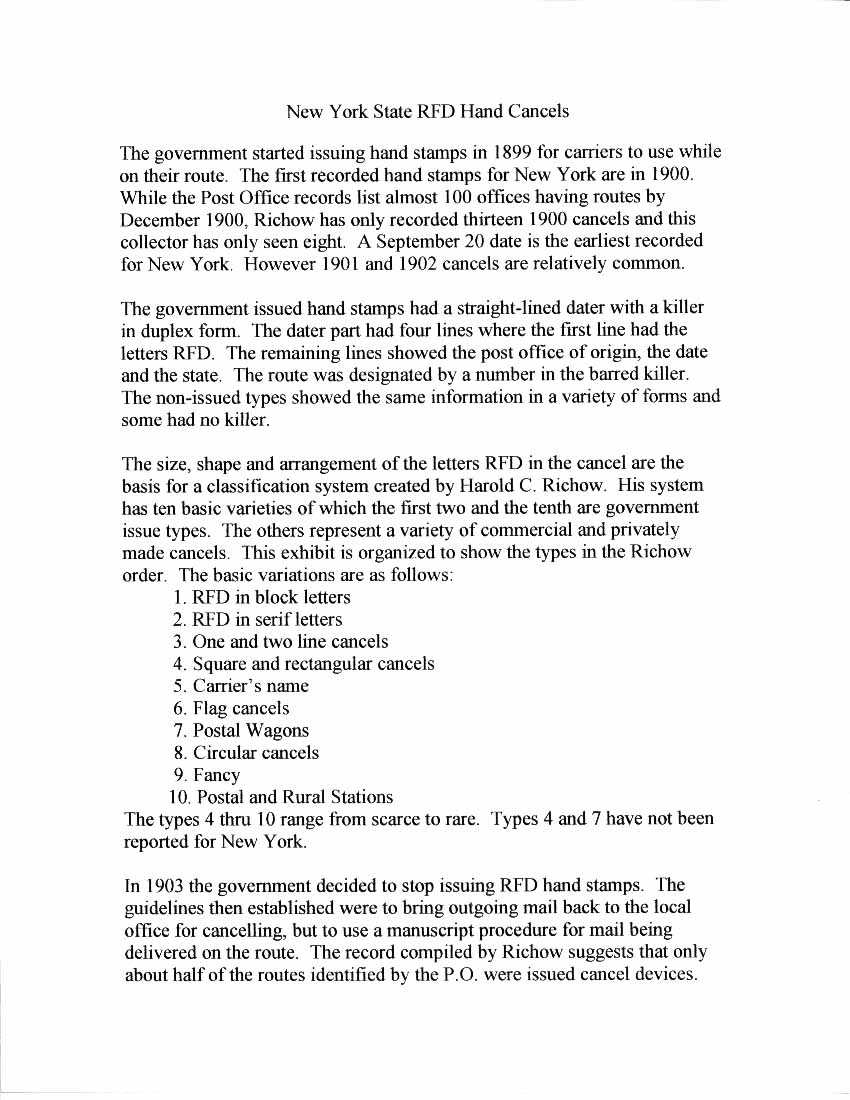 Government issue and private hand cancellations are used to illustrate the many facets of RFD service in early 20th century New York State. |