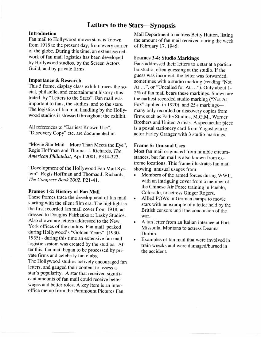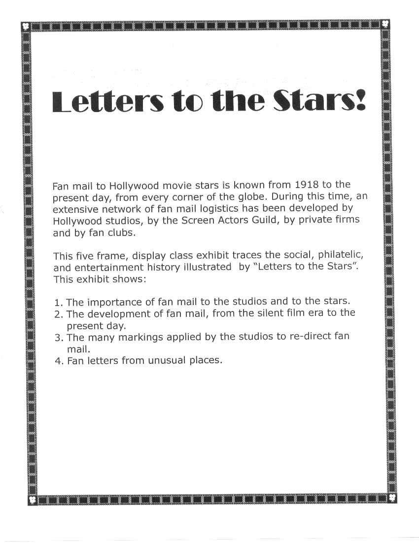 This exhibit traces silent era to modern day fan mail to Hollywood movie stars in a unique blend of postal, social, and entertainment history. |
