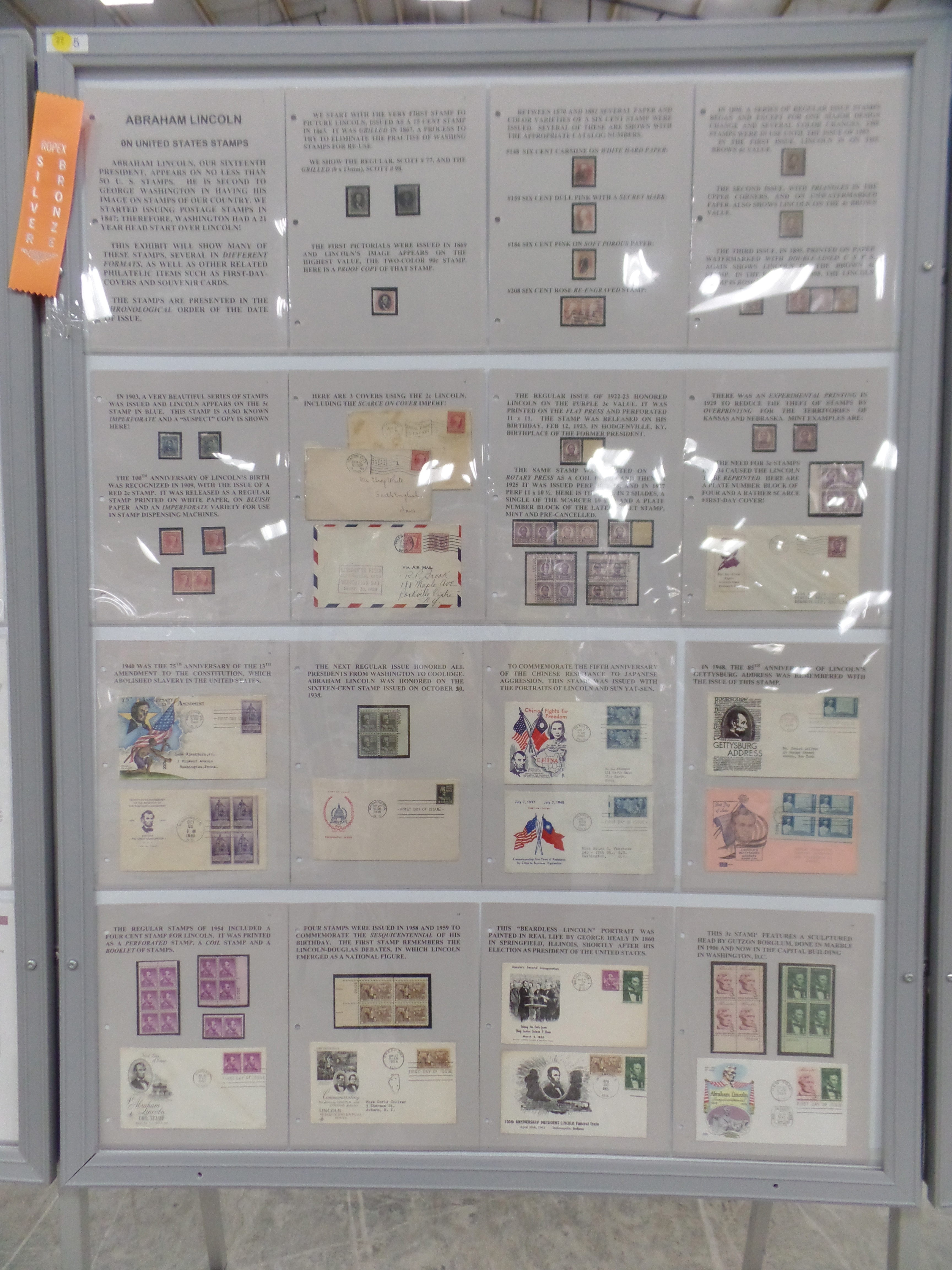Abraham Lincoln as depicted on over 50 U.S. stamps in chronological order in a variety of formats.